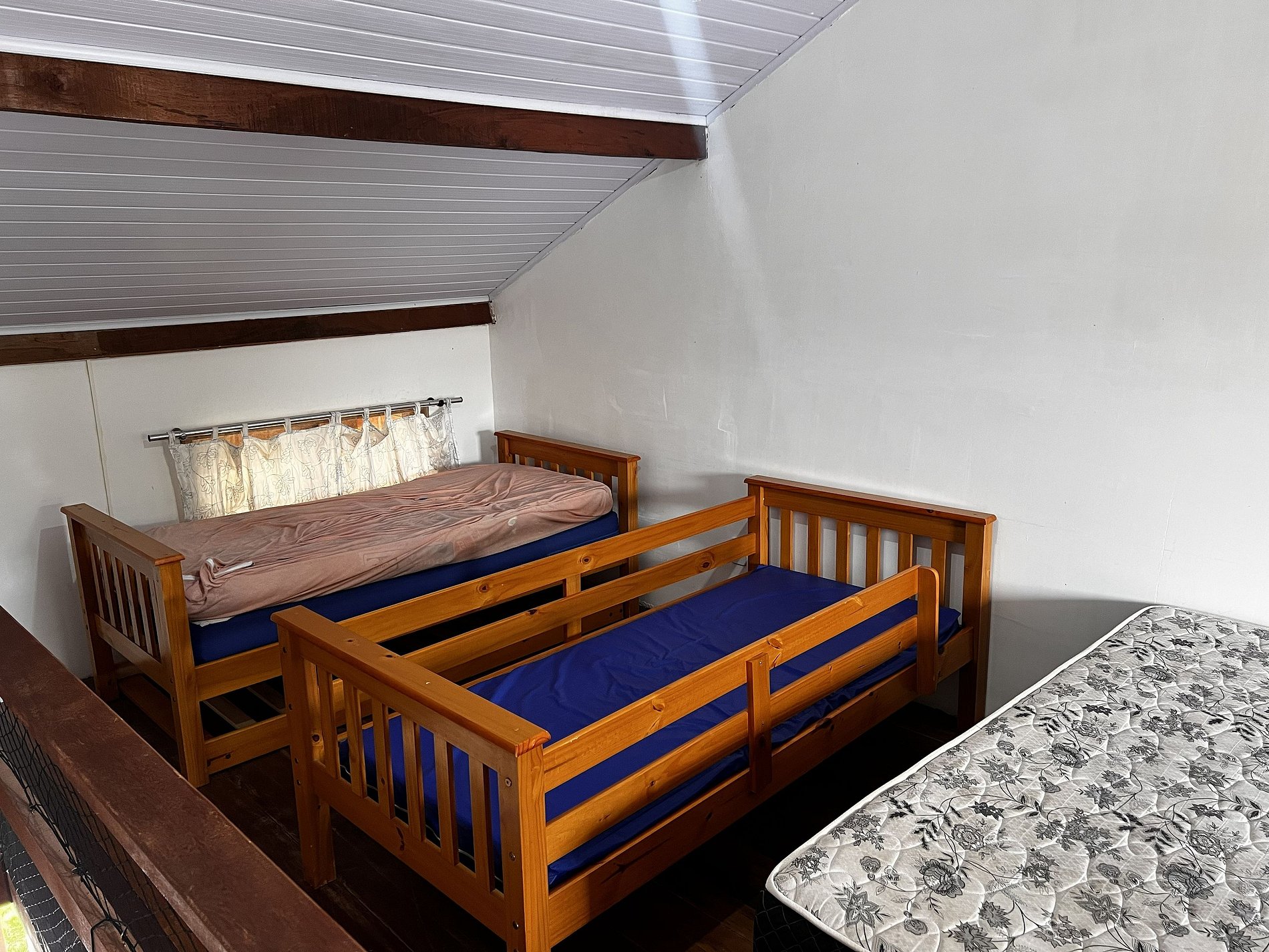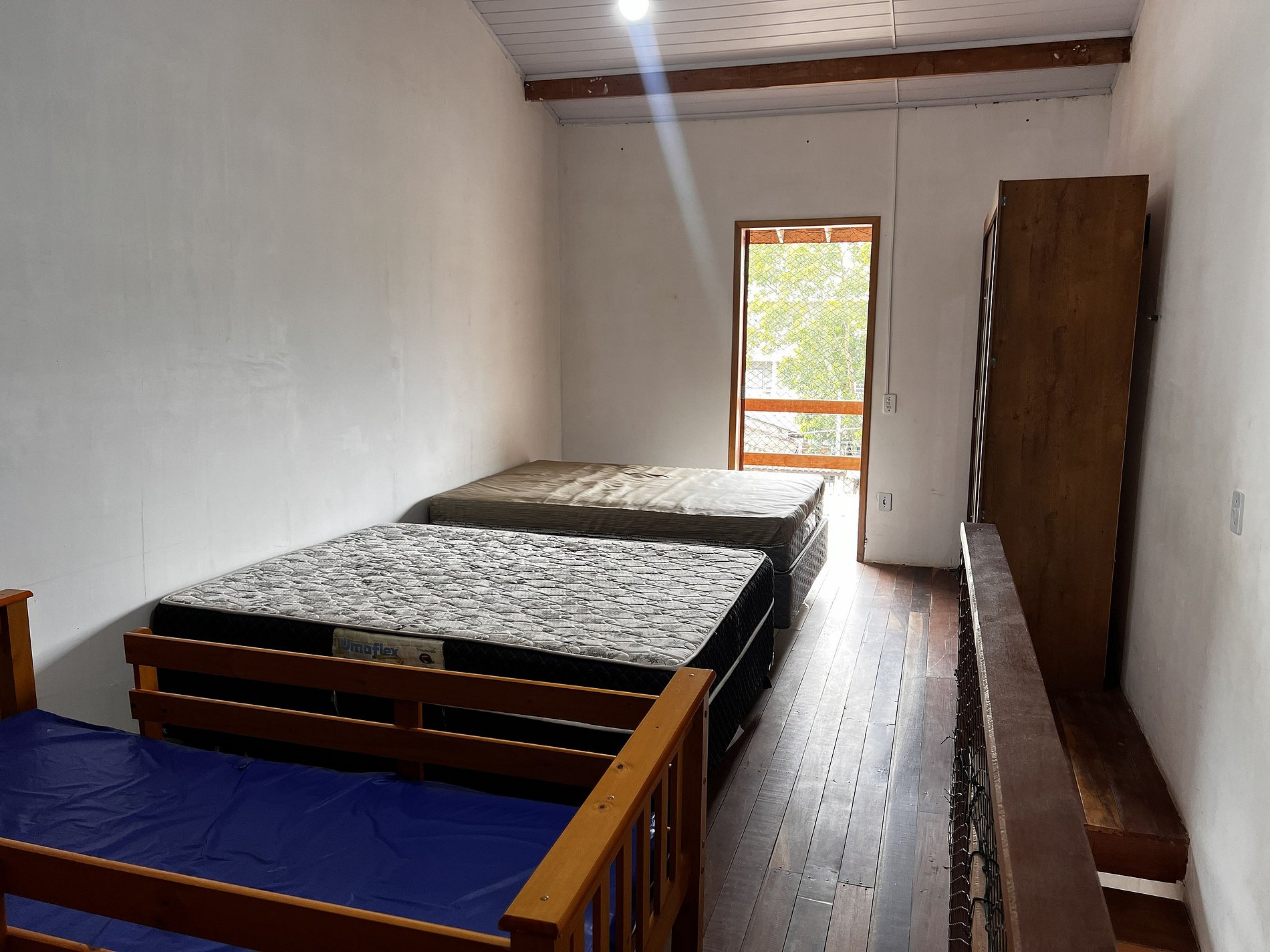 Apartamento com quarto amplo com duas camas box de casal, três camas de solteiro e guarda-roupa .