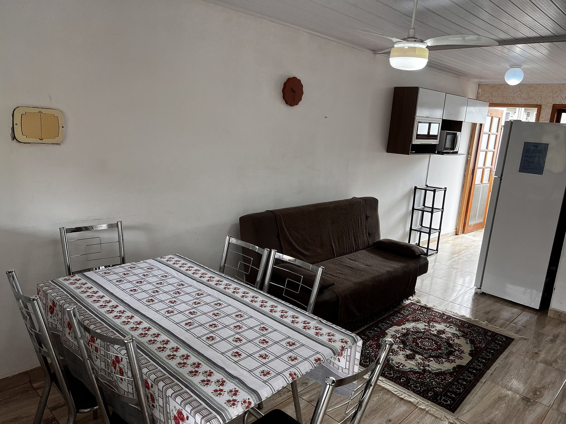 Sala de estar e jantar , com mesa e acentos, sofá cama, ventilador de teto, Smart TV com acesso a Net flix e You Tube , além de Wi-fi,