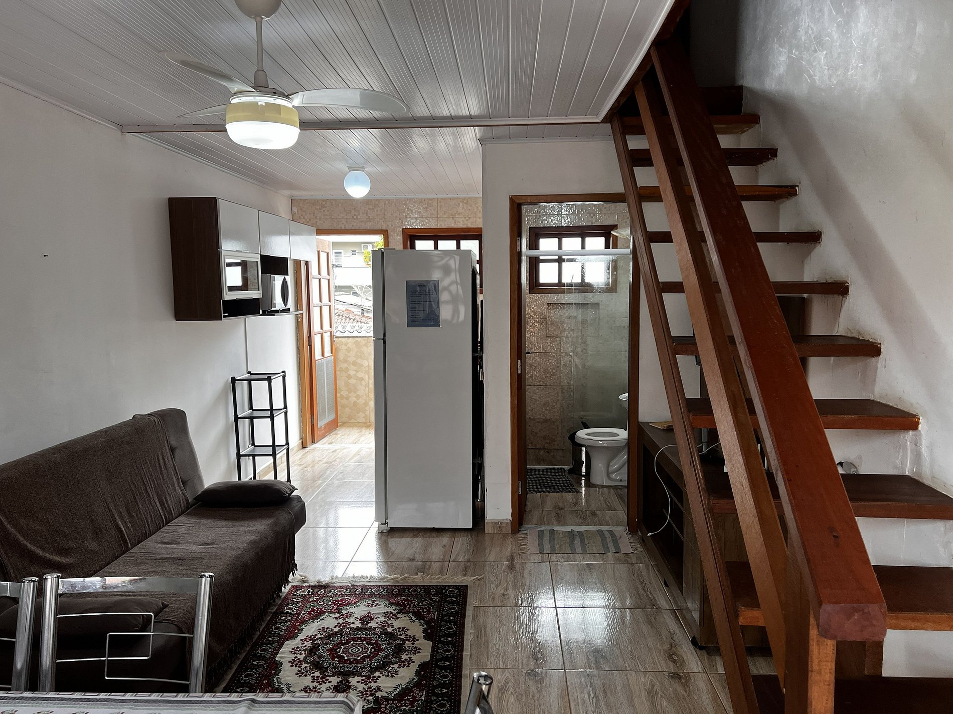 Equipada com utensílios incluídos: Geladeira, fogão de quatro bocas com forno, micro-ondas, pratos, talheres, copos, xícaras, panelas, garrafa térmica com suporte, liquidificador