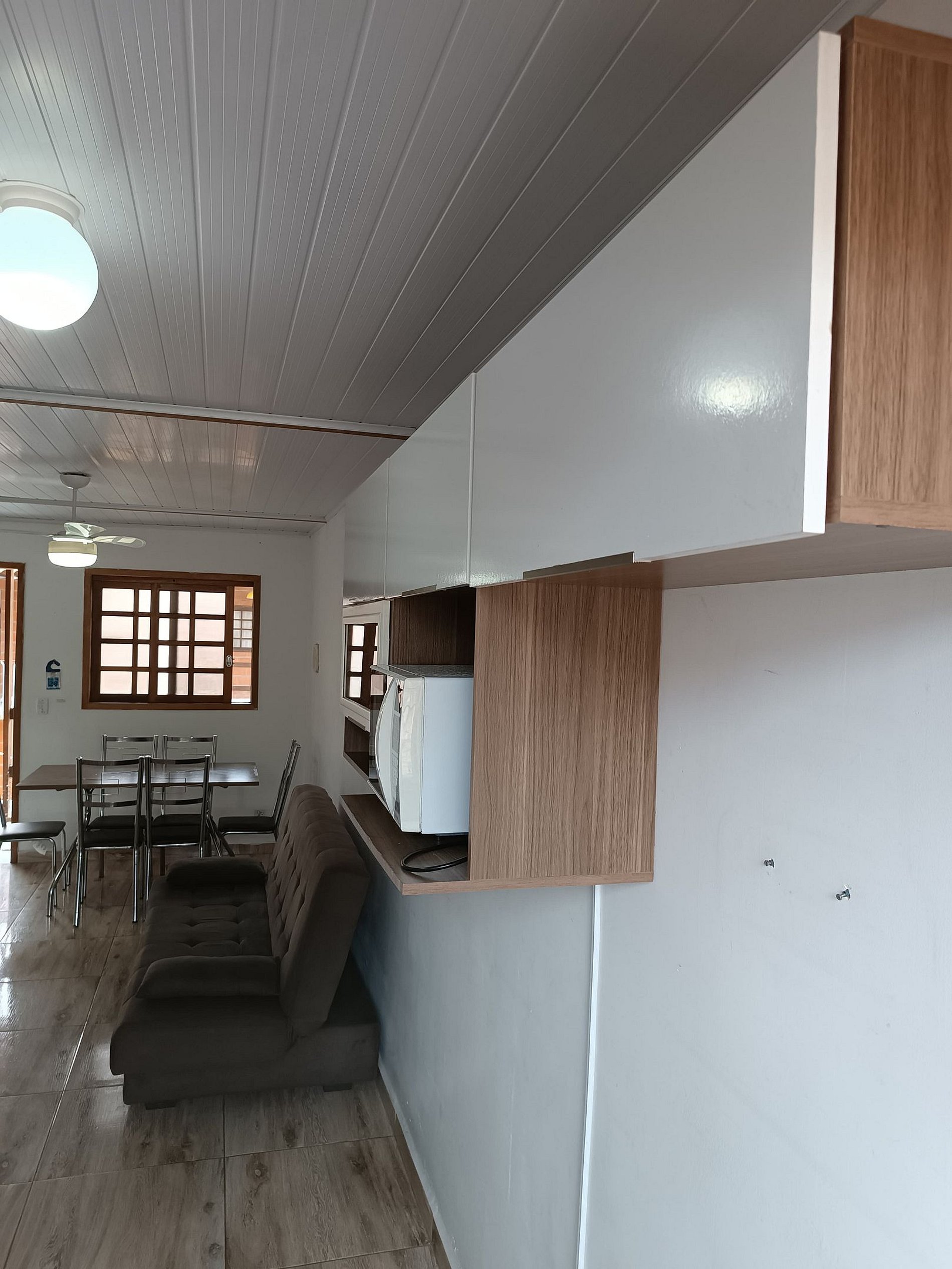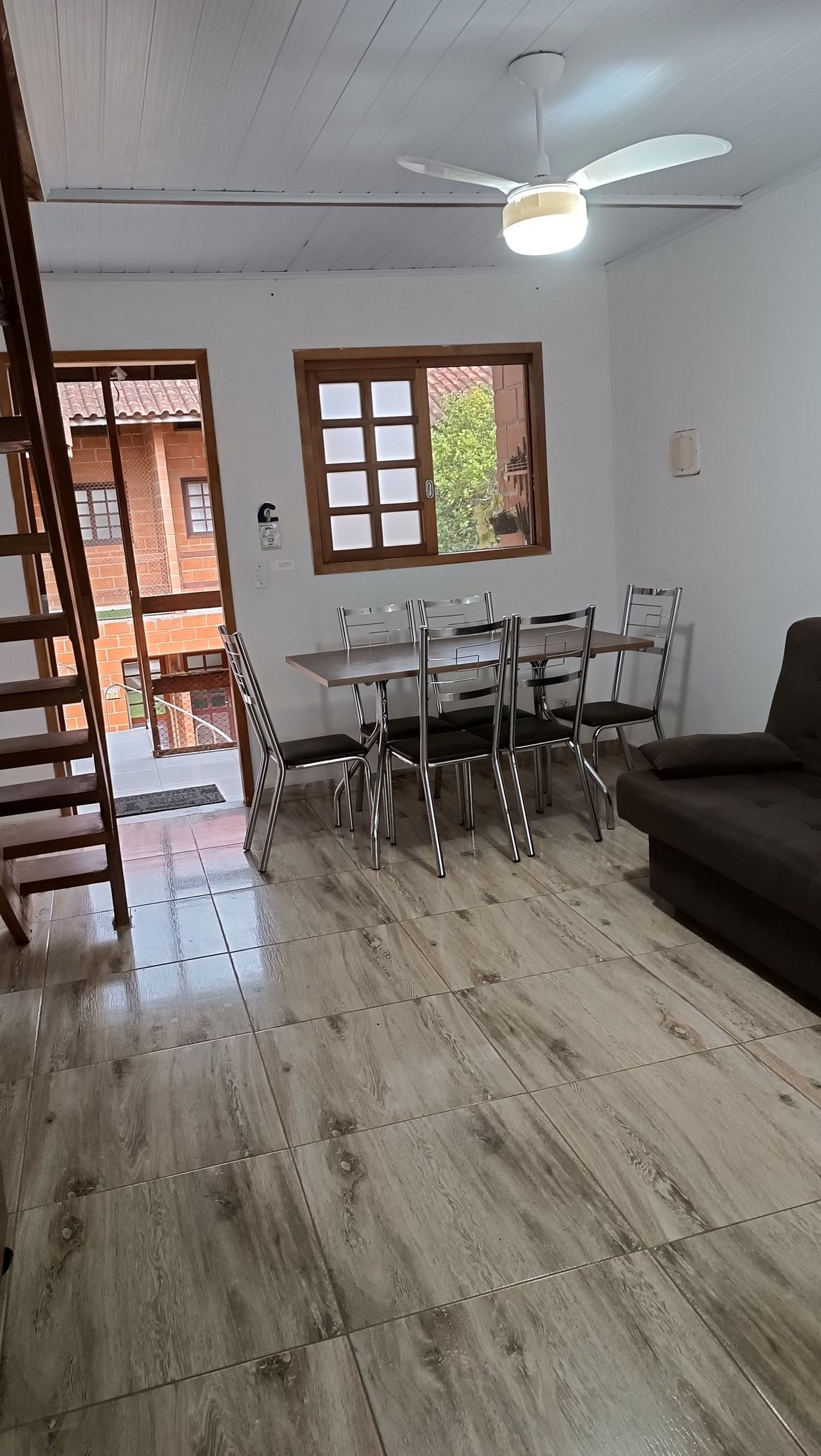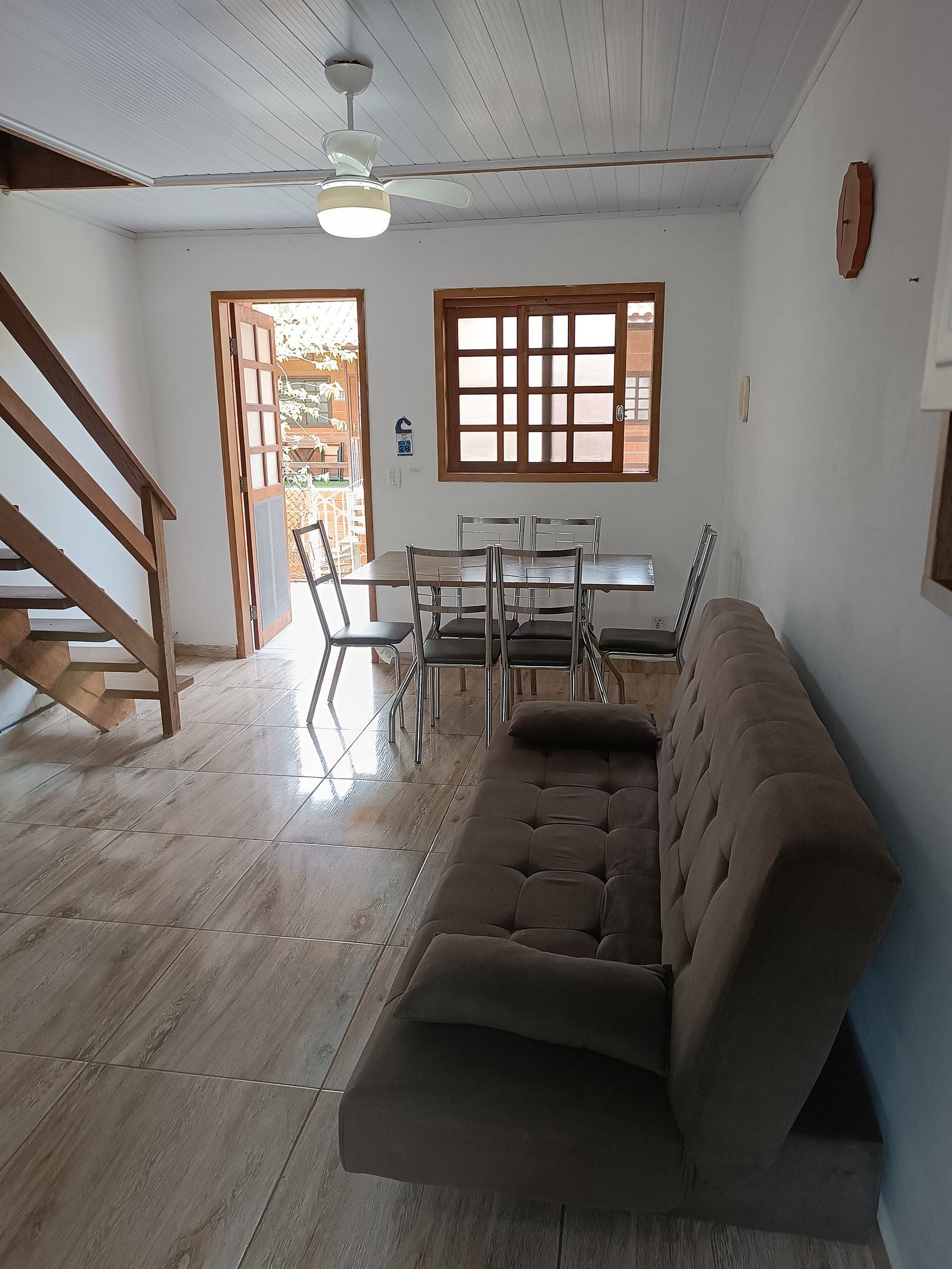 Sala de estar e jantar , com mesa e acentos, sofá cama, ventilador de teto, Smart TV com acesso a Net flix e You Tube , além de Wi-fi,