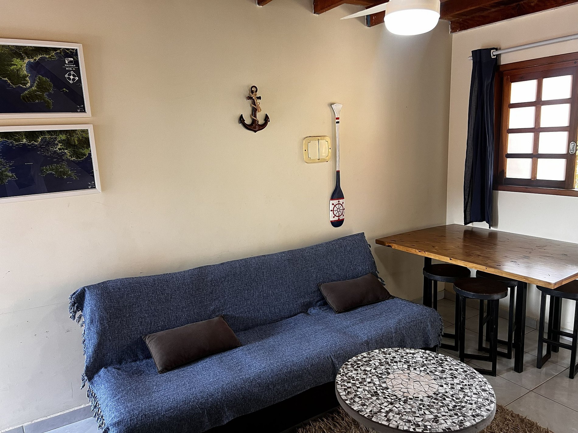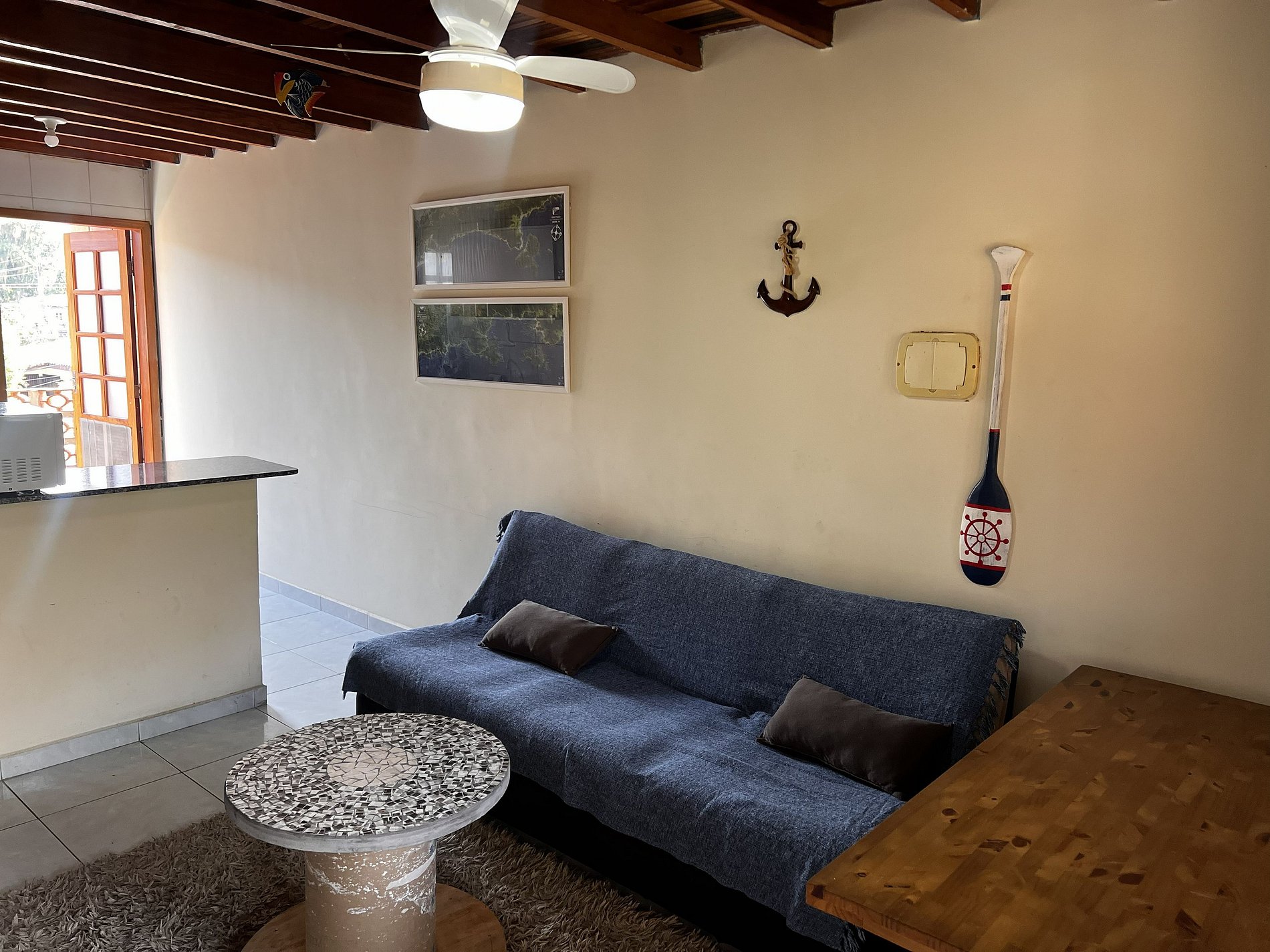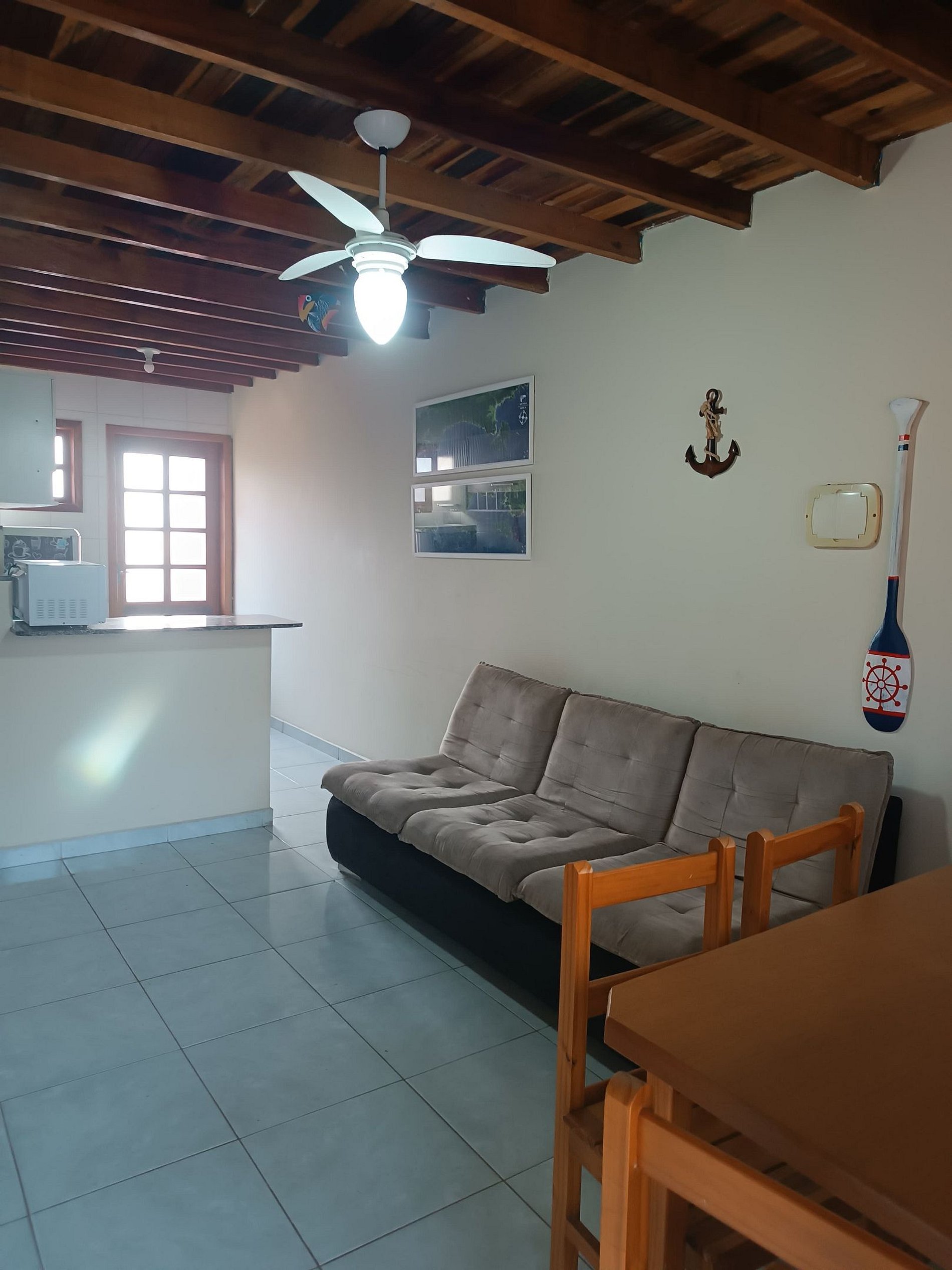 Sala de estar e jantar , com mesa e acentos , sofá, ventilador de teto, Smart TV com acesso a Net flix e You Tube , além de Wi-fi,