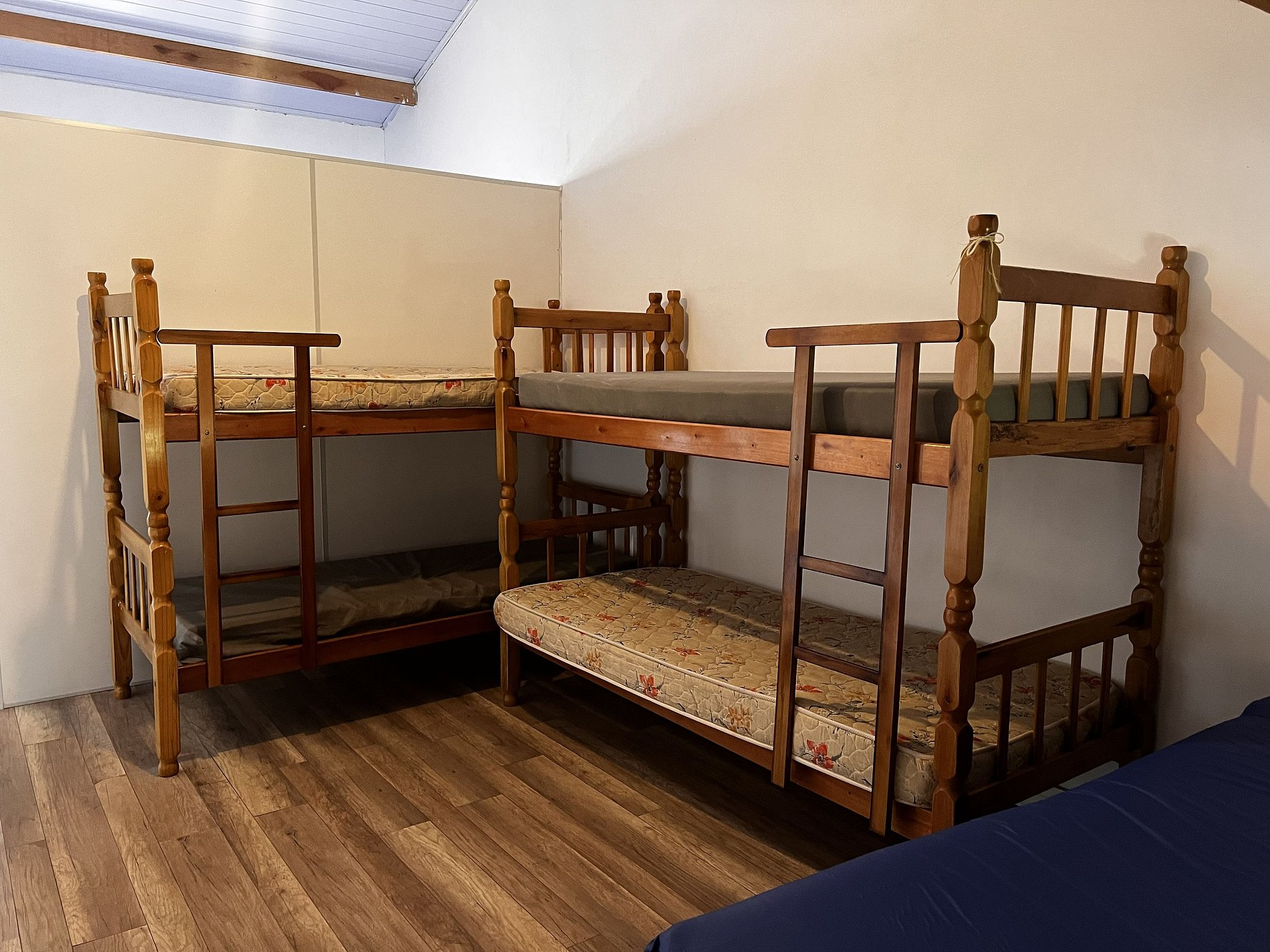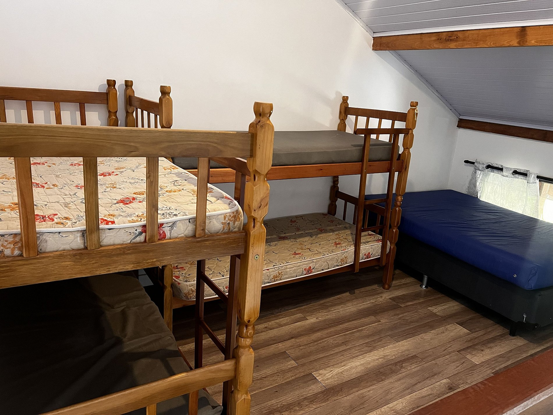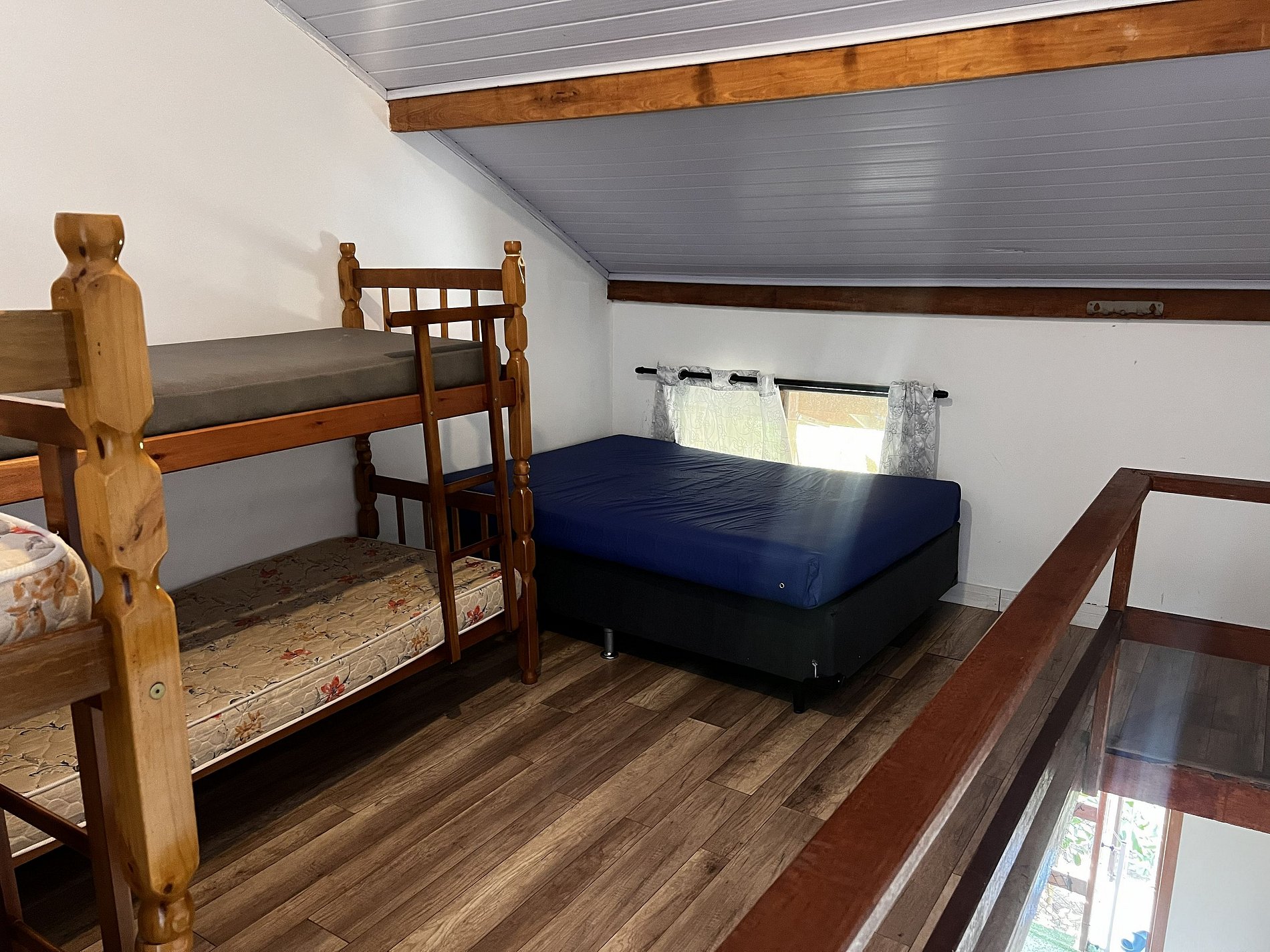 Outro quarto conta com uma cama boxe de casal e duas beliches, ventilador de teto, garantindo conforto e praticidade.