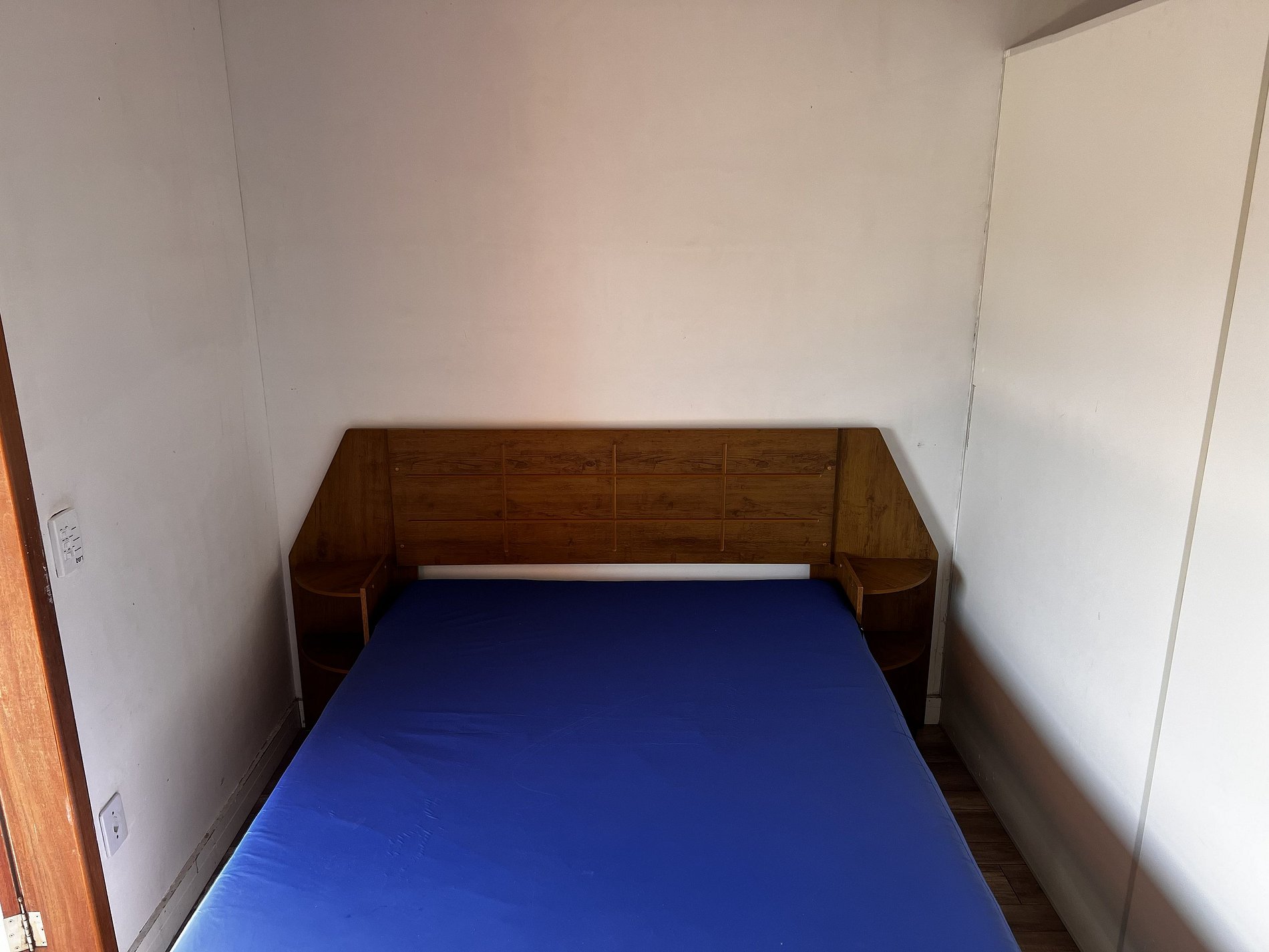 Apartamento com dois quartos, um quarto conta com uma cama box de casal, criado-mudo e armário.