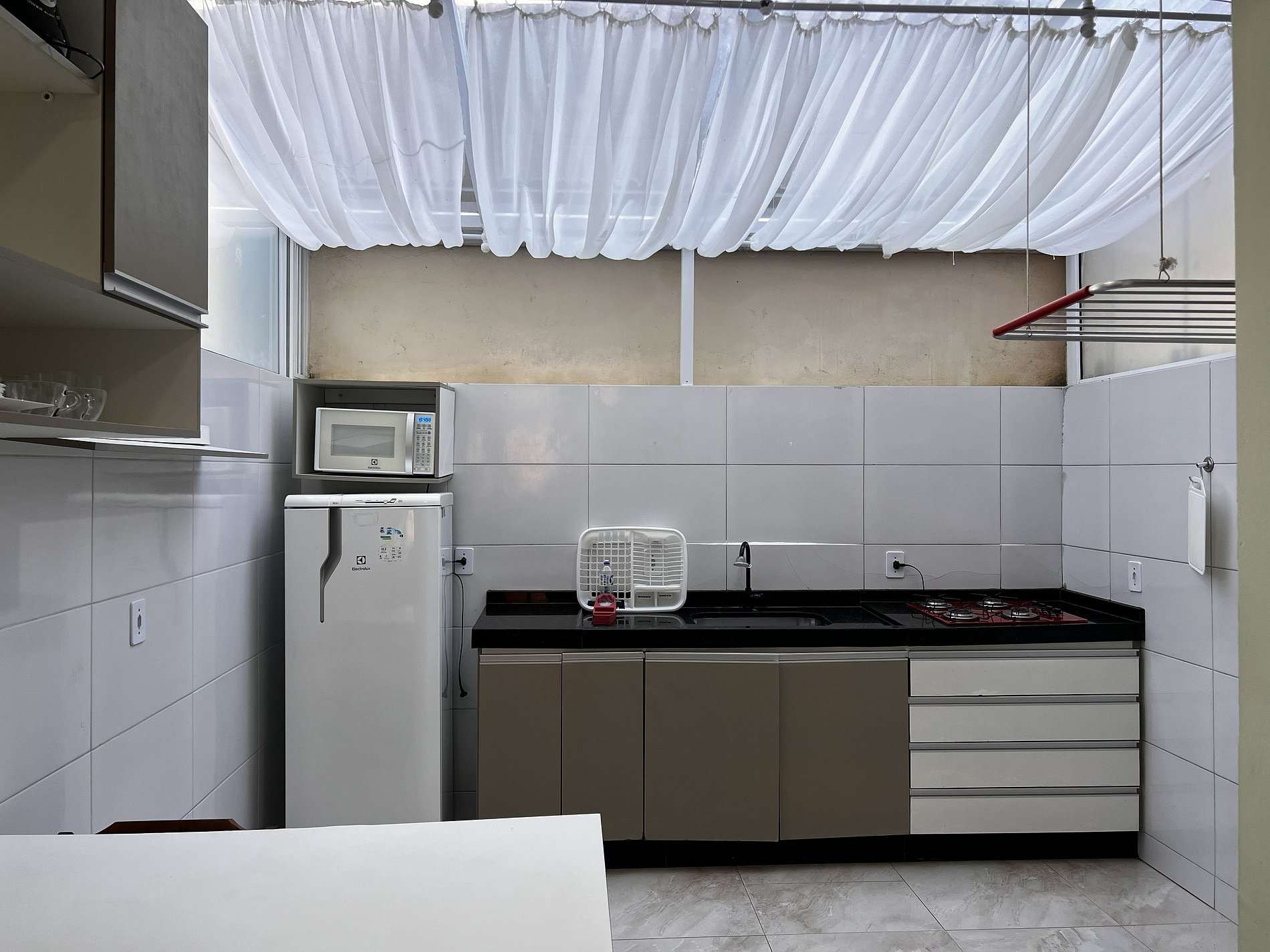 Equipada com utensílios incluídos: Geladeira, fogão cooktop, micro-ondas, pratos, talheres, copos, xícaras, panelas, máquina de café , liquidificador, mesa com acentos e ventilador de parede.