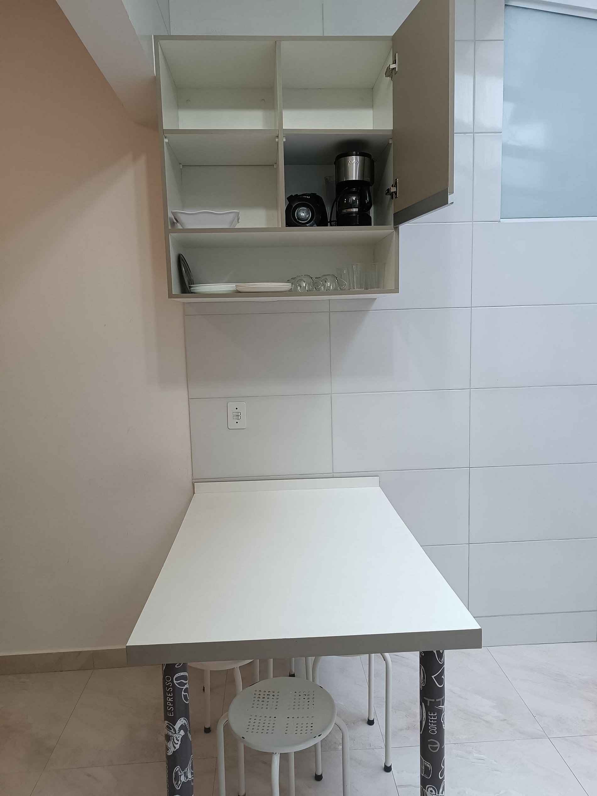 Equipada com utensílios incluídos: Geladeira, fogão cooktop, micro-ondas, pratos, talheres, copos, xícaras, panelas, máquina de café , liquidificador, mesa com acentos e ventilador de parede.