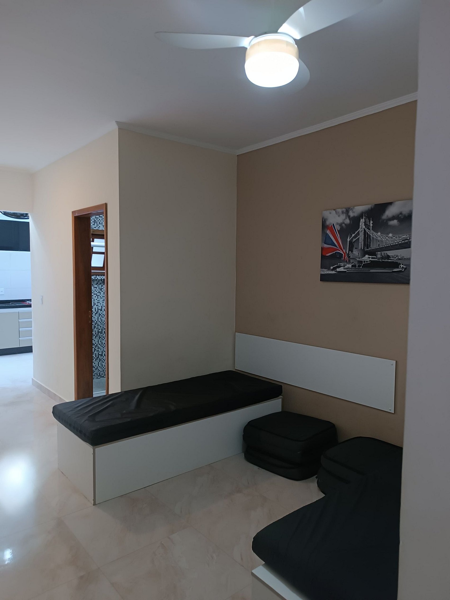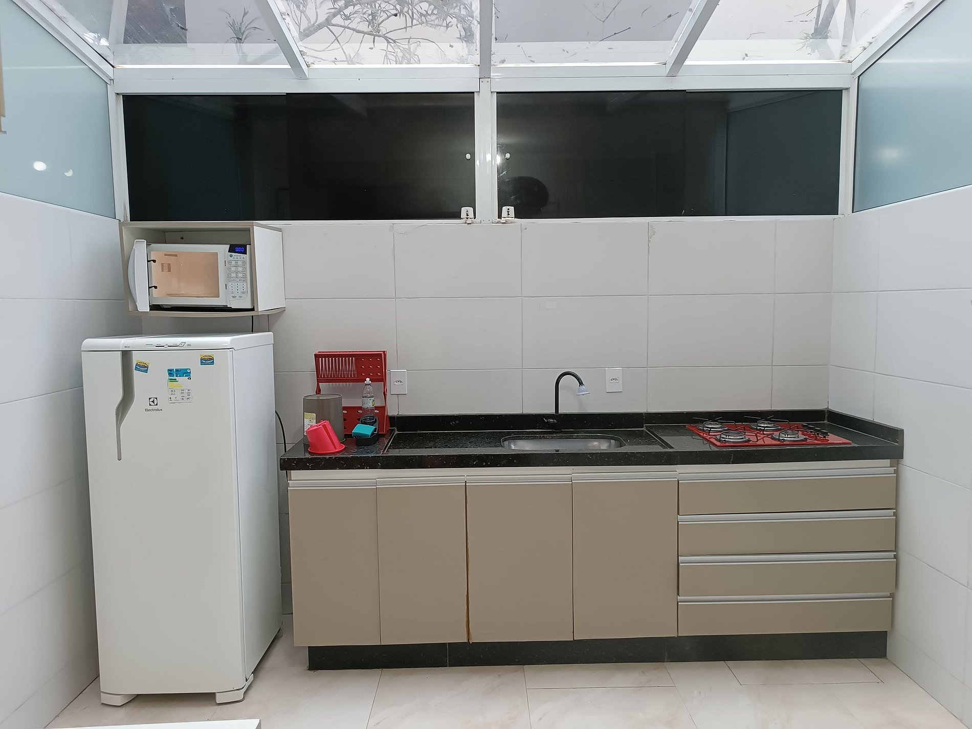 Equipada com utensílios incluídos: Geladeira, fogão cooktop, micro-ondas, pratos, talheres, copos, xícaras, panelas, máquina de café , liquidificador, mesa com acentos e ventilador de parede.