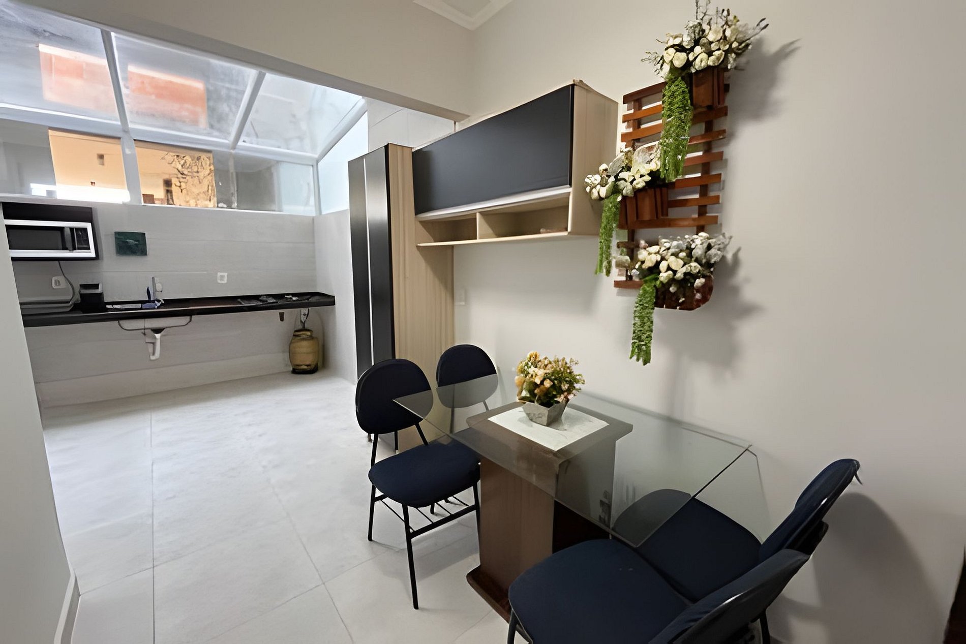 Equipada com utensílios incluídos: Geladeira, fogão cooktop, micro-ondas, pratos, talheres, copos, xícaras, panelas, máquina de café , liquidificador, mesa com acentos e ventilador de parede.